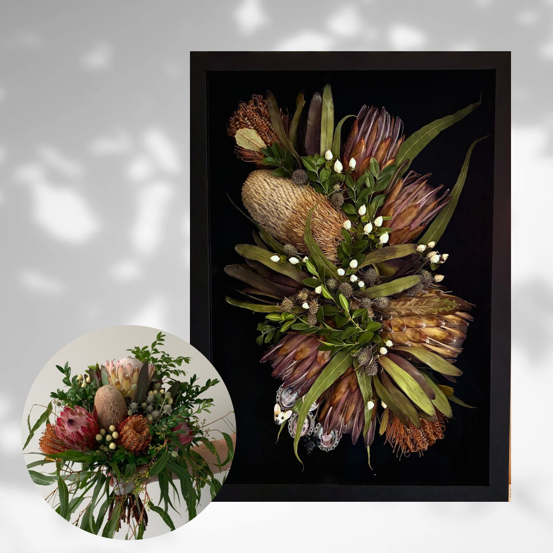 Highly recommend Becky to preserve your wedding bouquet. My bouquet was a few days old and I made the last minute decision to contact Becky to see what I could do. I was expecting her to say that they were too old. But to my suprise she advised me we could still make it work and I arranged for her to collect my flowers… Then came the flow of tears when she dropped them back to me. What an absolute talent. The frame, the arrangement and the love that her and Tom put into them are so evident. It was better than I expected and I get to look at my flowers everyday. Thank you so much!